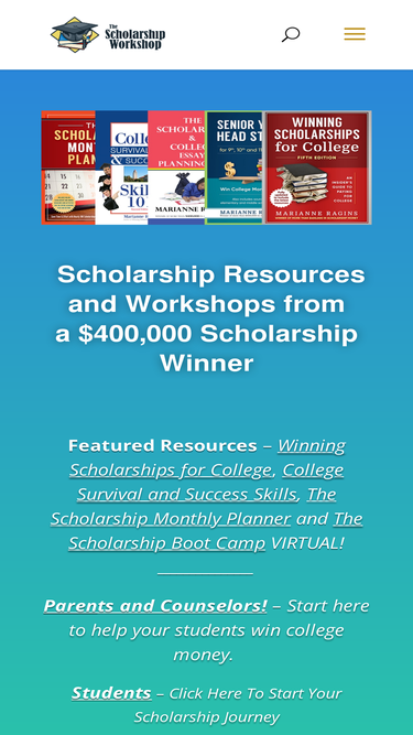 100%Help your student cut college costs! The ScholarshipWorkshop offers boot camps, books, and proven tools for finding and winning scholarships.
