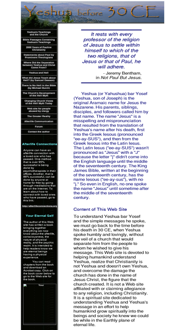 yeshua before 30 c.e. is dedicated to helping people understand yeshua's teachings entirely separate from the church that grew up soon after his death, calling him jesus or christ. the site is non-denominational and non-religious. it contains only the teachings of yeshua from the gospels.