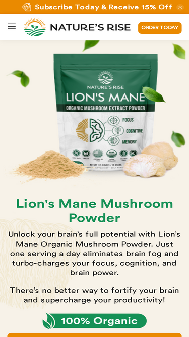 82%Nature's Rise is an organic wellness mushroom supplement company for people on an epic journey to physical and mental well-being, health, self-improvement, and brain health. This includes functional mushroom products, as well as other superfoods and nutrients.
