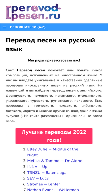 80%данный сайт включает в себя более тысячи иностранных песен с переводом на русский язык, каждая страница содержит текст песен как на английском языке, так и на русском