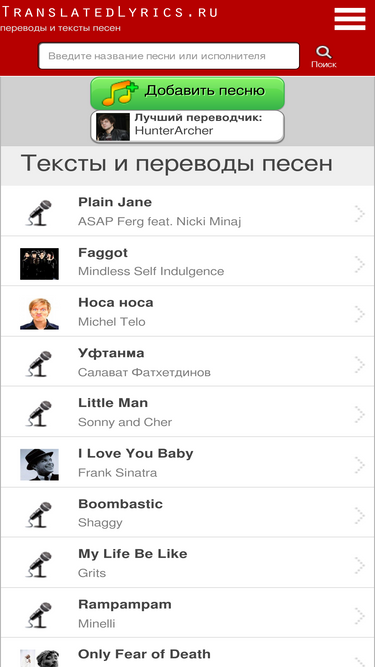 тексты песенок более 1.960.000 текстов песен и переводов исполнителей со всего мира, c помощью удобного поиска по текстам всего архива, конкретного исполнителя и названию поможет быстро и легко найти нужные тексты песен.