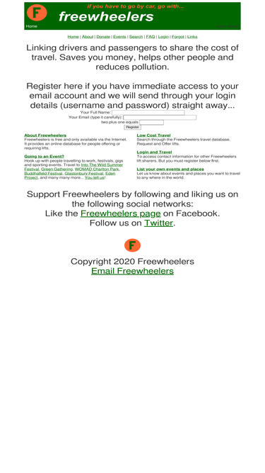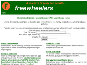 99%freewheelers home - the free international lift sharing website. linking drivers and passengers to share the cost of travel. saves you money, helps other people and reduces pollution. hook up with people travelling to work, festivals, gigs and sporting events. be environmentally friendly.