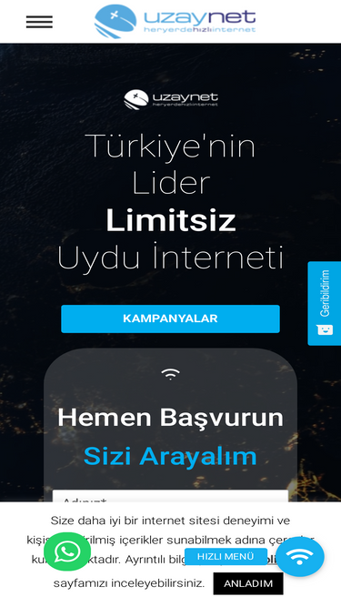 89%Sıkça Sorulan Sorular Uzaynet Teknik Abonelik Ödeme Uzaynet uydu internet nedir? Uzaynet, internet erişimi için kullanılan çift yönlü yüksek hızlara erişebilen geniş bant uydu internet hizmetidir. Uzaynet uydu internet hizmetini kullanmak için telefon hattına ihtiyacınız yoktur. Detaylı bilgi için tıklayınız. Uzaynet kurulum süreci nasıl işler? Uzaynet uydu internet hizmeti kurulumu, abonelik başvurunuzdan en geç 7 (yedi) iş günü içerisinde, kurulum ekiplerimizin belirttiğiniz adrese gelerek ve size özel bir kurulum sağlayarak tamamlanır. Olumsuz hava şartlarında internetim kesilir mi? Uzaynet uydu interneti anteni 160 km/h hızla esen rüzgarlara dayanacak şekilde tasarlanmıştır. Aşırı yoğun yağmur veya kar haricinde uydu internet hizmeti sağlıklı bir şekilde verilebilmektedir. Uzaynet ile online oyun oynayabilir miyim? Uzaynet anteni yaklaşık 36.000 km uzaydaki uydu ile haberleşerek internet sağlar. Bu mesafe yaklaşık 600ms bir gecikme meydana getirdiğinden, gerçek zamanlı online oyun deneyiminiz olumsuz etkilenebilir. Uzaynet sistemi kaç kilogram? Uzaynet uydu internetin toplam set ağırlığı yaklaşık 15 kg dır. Çanak antenin boyutu ne kadar? Uzaynet uydu interneti anteni 77 cm ile en fazla 120 cm çapında olabilmektedir. Sabit IP hizmeti sunuyor musunuz? Evet. Uzaynet uydu internet servislerinde aylık 200 TL ek ücret karşılığında (1) bir adet sabit/statik IP kullanabilirsiniz. Uzaynet ile VPN kullanabilir miyim? Evet. Sabit IP’niz olduğu taktirde VPN, CIR Tunel uygulamalarını kullanabilirsiniz. Özel uygulamalarınız için Uzaynet teknik destek ekibimiz ile iletişime geçebilirsiniz. Kampanya değiştirebilir miyim? Uzaynet limitsiz kampanyaları başka bir kampanya ile birleştirilemez. Detaylı bilgi için; 0800 603 00 00 çağrı merkezimiden bize ulaşabilirsiniz. Uzaynet garanti süresi ne kadar? Uzaynet montaj yapıldıktan sonra 2 yıl süresince garantilidir. Garanti dışı, yerinde servis hizmeti için 3250 TL servis ve km başına 10.50 TL yol ücreti uygulanır. Uzaynet'i iade edeb