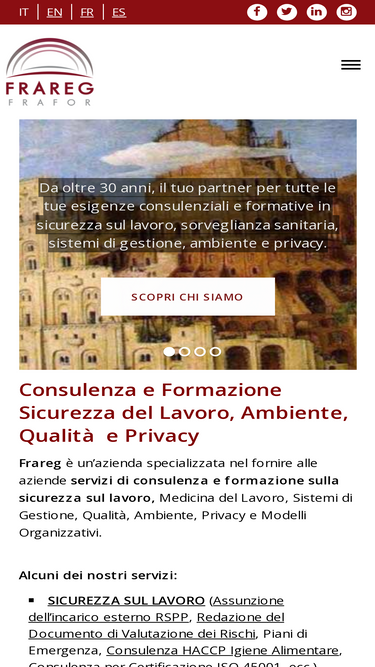 62%Frareg è specializzata in consulenza e formazione in materia di sicurezza sul lavoro, qualità, ambiente e privacy. Scopri tutti i servizi e corsi disponibili!