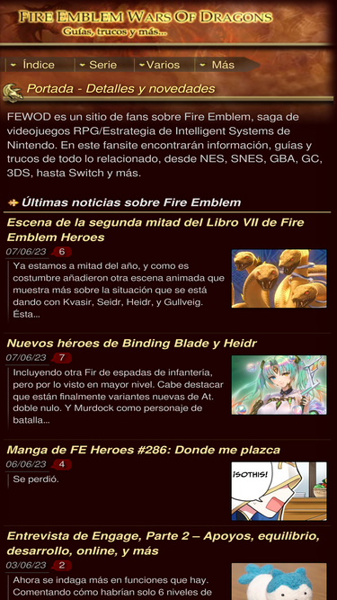 85%Información, datos, noticias, trucos y guías de toda la serie de Fire Emblem. Sitio de fans.