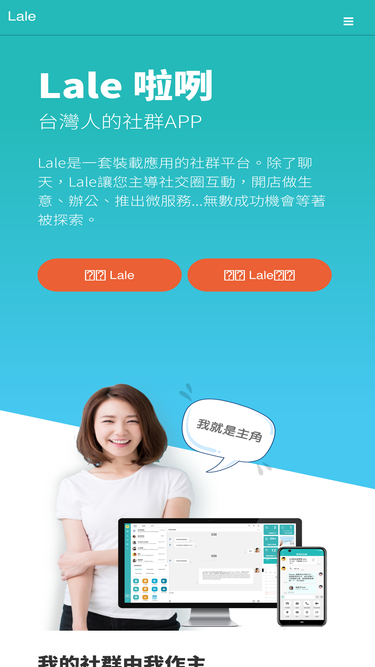 85%「lale」是一個社群app、社群平台、聊天app。啦咧是台語聊天的意思。lale可運用於即時通訊、社群電商、社群行銷、雲端辦公、開發微服務(mini app)。「lale服務」是lale上的商務工具,包含各式各樣的網路開店、雲端辦公、智慧生活工具。