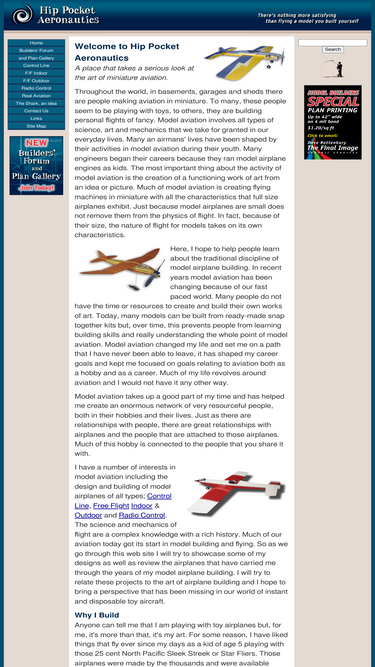 100%hip pocket aeronautics examines what it takes to build your own radio control airplanes, control line airplanes and free flight airplanes. our focus is on helping you understand that you can learn about, and enjoy, model aeronautics from a builder's point of view. there's nothing more satisfying than flying a model you've built yourself.