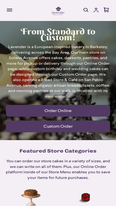 freshly baked desserts from our bakery in berkeley. customize your own cake or order a wedding cake online at lavender bakery!