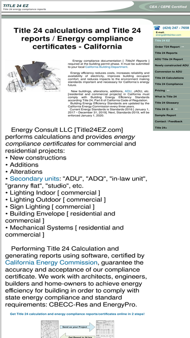 Title 24 Reports California and Title 24 calculations online service. ADU, residential, non-residential energy compliant requirements, compliance certificates. CEA CEPE Certified energy consultants. Free consultation (424) 247-7658