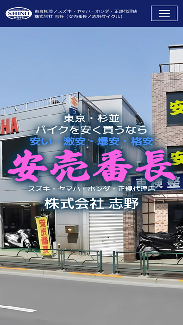 98%東京都杉並区のバイク販売店「株式会社 志野」は、スズキ・ヤマハ・ホンダの正規代理店として、新車・中古バイクを格安価格で提供しています。関東運輸局認証工場を完備し、車検・修理・整備もお任せください。常時豊富な在庫と全国通販対応でお客様のニーズにお応えします。