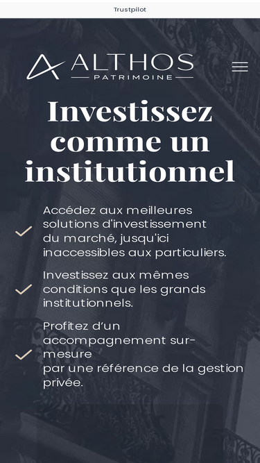 88%▷ Accédez aux meilleures solutions d'investissement du marché, jusqu'ici inaccessibles aux particuliers. Investissez aux mêmes conditions que les grands institutionnels. Profitez d’un accompagnement sur-mesure par une référence de la gestion privée.