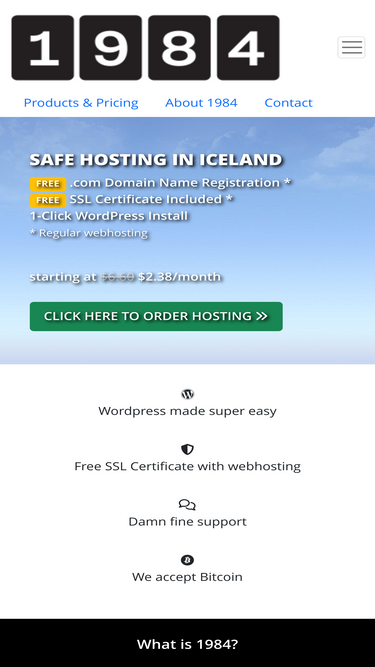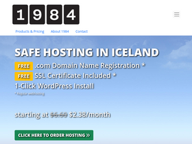 100%1984 is a green ethical hosting company in iceland. founded in 2006, 1984 has been dedicated to freedom of speech. we offer the traditional ready to use webhosting with mail services. vps with preconfigured wireguard setup, openvpn, nextcloud and more. we continue to offer freedns where you can host as many domains as you like with no restrictions.