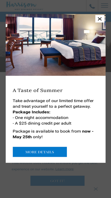 100%Discover exclusive Harrison Hot Springs Resort specials and vacation packages in British Columbia, including Bed & Breakfast deals, Breakaway and Getaway packages, Hot Dates & Hot Rates, and gift card offers. Enjoy natural hot springs, lakeside views, and seasonal resort savings on your next Harrison Hot Springs getaway!
