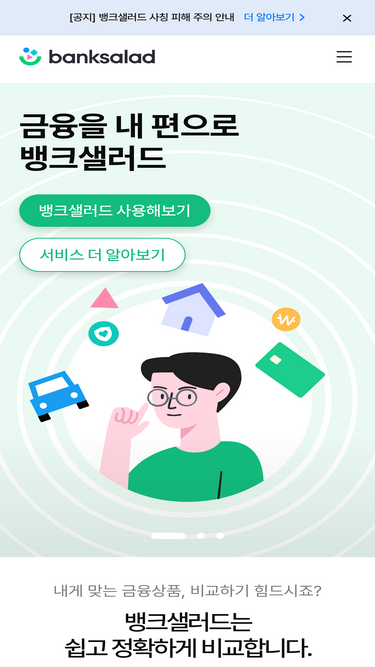 84%금융을 넘어 건강 자산까지 뱅크샐러드 - 신용대출 · 신용카드 · 주택담보대출 · 예적금 · 무료 건강 검사