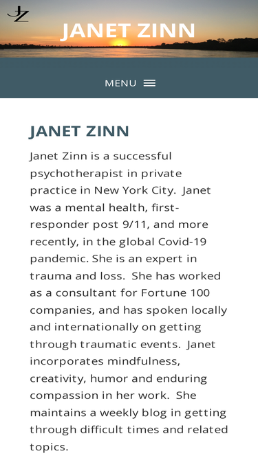 100%janet zinn is a successful psychotherapist in private practice in new york city. janet was a mental health, first-responder post 9/11, and more recently, in the global covid-19 pandemic. she is an expert in trauma and loss. she has worked as a consultant for fortune 100 companies, and has spoken locally and internationally on getting through traumatic events. janet incorporates mindfulness, creativity, humor and enduring compassion in her work. she maintains a weekly blog in getting through difficult times and related topics.