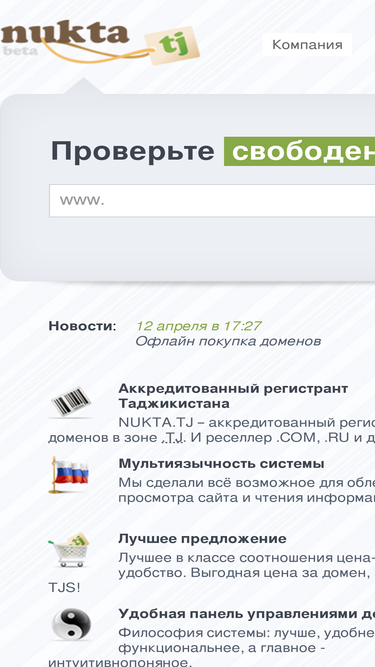 nukta.tj является регистратором доменных имён в зоне .tj на территории республики таджикистан, включая города: душанбе, худжанд. зона .tj является национальной зоной таджикистан. купите домен в зоне .tj!