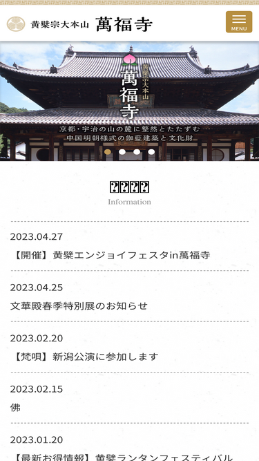 86%黄檗宗大本山「萬福寺」の公式サイトです。京都府宇治市にある日本三禅宗の一つ黄檗宗の大本山の寺院「萬福寺」。日本では他に例が無い中国明朝様式を取り入れた禅宗伽藍建築と数々の文化財。萬福寺で体験できる禅体験や普茶料理についてもご案内しております。