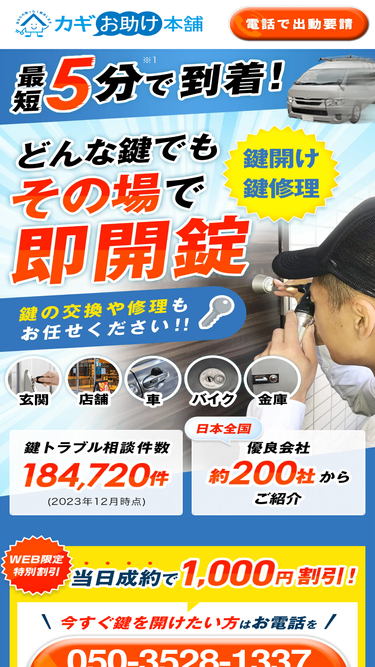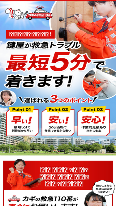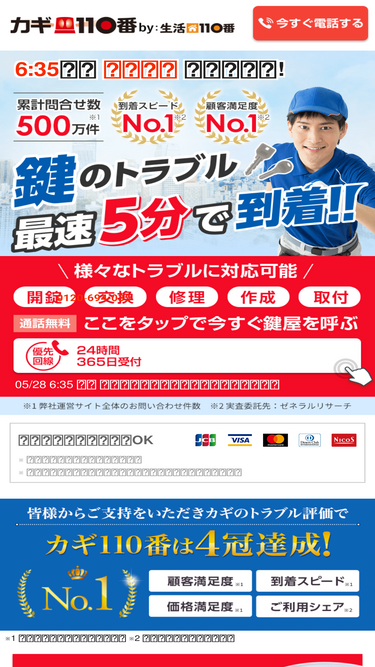 98%カギの救急110番が全国の鍵トラブルは駆け付けます。24時間365日対応だから深夜や早朝にもお伺いできます。鍵開け、鍵交換、鍵修理、鍵作成、鍵取付など何でもお任せ下さい。