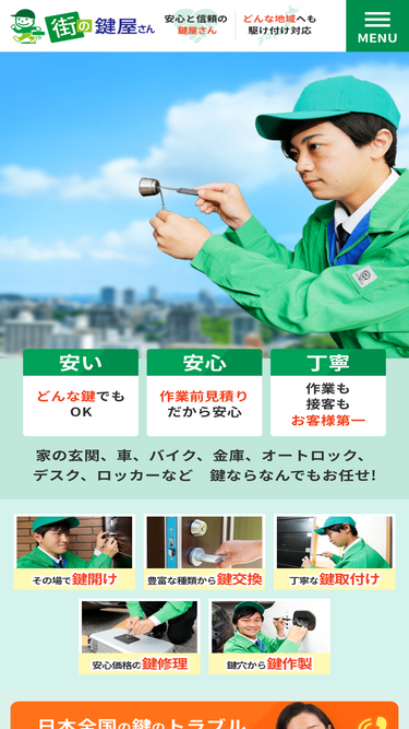 街の鍵屋さんは地域密着です。親しみやすさを意識していますので、鍵のことなら何でも相談していただけると幸いです。24時間全国どこへでも鍵の緊急トラブルに急行いたします。
