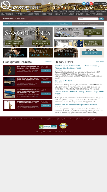 79%if you love the sax, you'll love saxquest! online store features quality saxophones, clarinets, mouthpieces, reeds & accessories. check out the sax museum, sax trivia contest, repair shop & more!