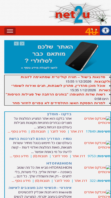 72%ספריית האתרים של ישראל מאז 2004 - מטרתו של אינדקס האתרים של נט2יו הוא להביא את תשומת לב הגולשים לאתרים יוצאי דופן באיכותם. בנוסף תמצאו באתר לוח אירועים גדול המחולק בצורה יעילה לפי נושאי האירועים, עדכוני רססים חיים מרחבי הרשת הישראלית ועוד...