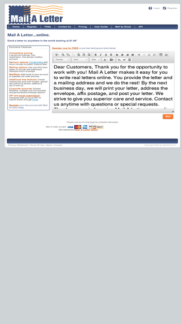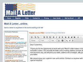 100%mail a letter...online. send a letter to anywhere in the usa from anywhere in the world for only $1.52; send letters, mail letter, write letter; online mailing service; free registration; mailaletter prints, stuffs, adds first class stamp, mails at post office; good for penpals, business, non-profit, military, virtual assistants