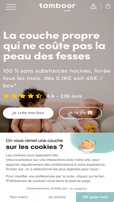 87%Les couches Tamboor Premium livrées tous les mois, sans avoir à y penser ! Une nouvelle couche hypoallergénique • sans perturbateurs endocriniens.