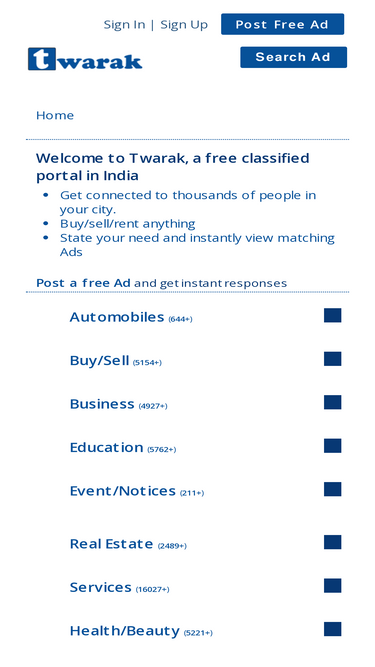 38%twarak.com is a free classified portal for indian users to post free ads and search for any requirement in automobiles, jobs, real estate any many other categories.