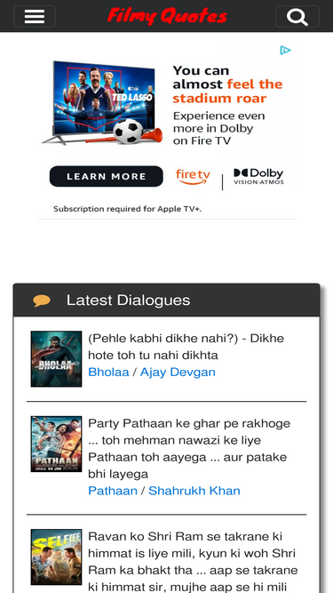 86%largest collection of hindi dialogues and lyrics with videos plus their english translation. organized by movies, stars, categories and much more.