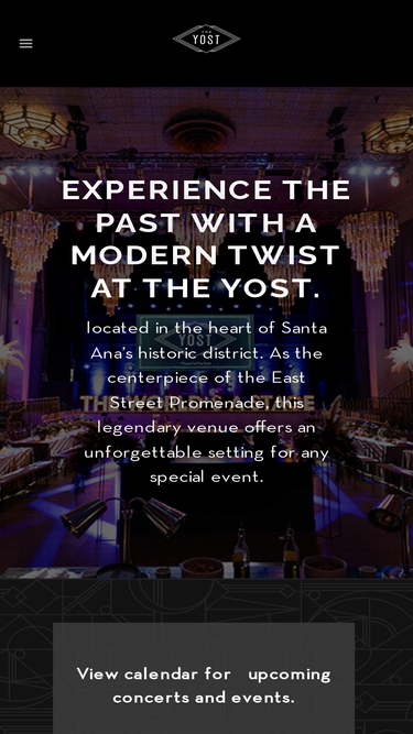91%continuing its long legacy as one of orange county’s oldest, largest and most versatile venues for live entertainment and special events, the yost has been an iconic landmark of santa ana’s vibrant downtown since 1912. beautifully renovated to host weddings, social and corporate events.