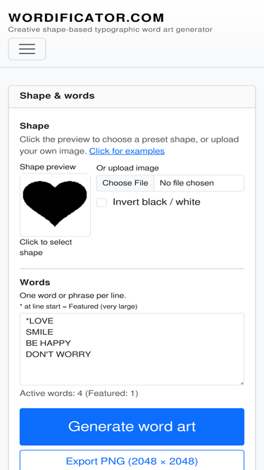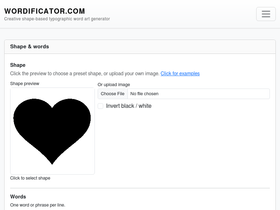 74%Create custom word art inside any shape. Generate high-resolution shape word clouds using your own words and images. Choose from hundreds of preset shapes, colors, and fonts.