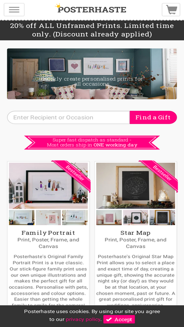 63%Together under the stars. Now you can bring the fun of our Family Portrait to our beautiful Star Map designs. Select your outlines, to bring friends & family together under the stars for your chosen date and time, with the print showing the actual constellations as they appeared, just like our Star Map designs. For a truly special gift, upgrade to our Hand-Framed Prints and Canvases. Gold and Silver frames now available! Your design will be Giclée printed on matte, museum-quality art paper for a perfect gift that will last a lifetime. We only use water-based, vegan-friendly inks, and our wood and paper products are sourced from sustainable forestry. Create brilliant Personalised Prints with Posterhaste.