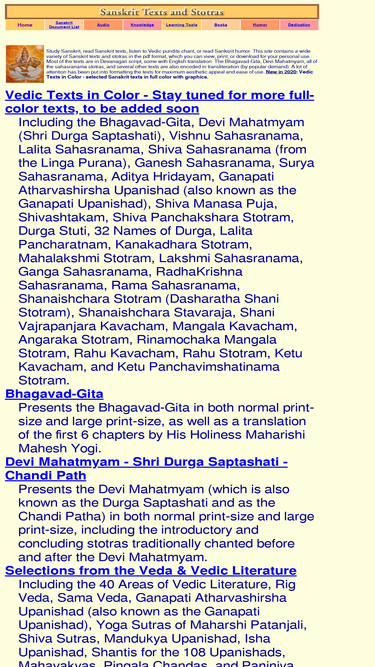 94%beautifully formatted sanskrit texts and stotras in pdf format, plus learning tools, audio recordings, and books.
