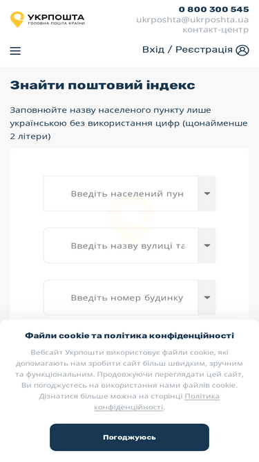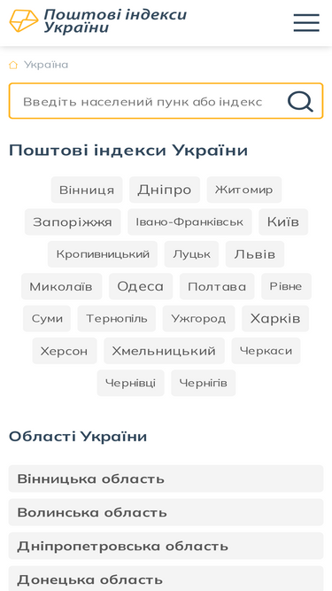 100%поштові індекси україни – це унікальна довідкова система. ви можете швидко знайти поштовий індекс чи поштове відділення будь якого населеного пункту україни, міста, вулиці