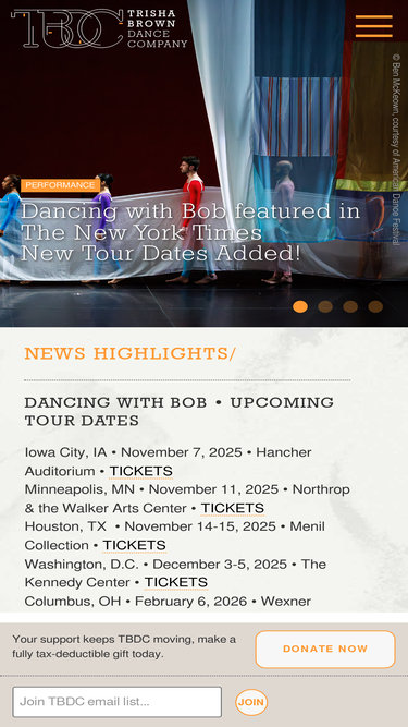 100%trisha brown dance company. tbdc is a post-modern dance company dedicated to the performance and preservation of the work of founding artistic director and choreographer, trisha brown. established in 1970, tbdc has toured throughout the world presenting the work, teaching and building relationships with audiences and artists alike. visual art and performance art. dance, dance workshops, dance lectures, dance demonstration, seminars, new york dance , in plain site, locus, water motor, accumulation, judson dance theater, museum of modern art, new york, movement research, danspace project, brooklyn academy of music, bam, city center, joyce theater, paris, france, england, london, streb, visual art, accumulation, geometry of quiet, a string, another story as in falling, astral convertible/converted, autobiography, canto pianto, carmen, curl curve backup, corners duet, da gelo a gelo, dance with a duck's head, discs, drift, falling duet, figure 8, five part weather invention, floor of the forest, for m.g. the movie, foray foret, glacial decoy, groove and countermove, group accumulation, group primary accumulation, homemade, how long does the subject linger at the edge of the volume, i love my robots, i'm going to toss my arms- if you catch them they're yours, if you couldn't see me, interlude 2 ladder, it's a draw, l'amour au theatre, l'orfeo, lateral pass, leaning duets, les yeux et l'âme, lightfall, line up, long and dream, luci mie traditrici, m.o, man walking down the side of a building, newark, o zlozony o composite, opal loop, pamplona stones, planes, present tense, primary accumulation, pygmalion, raft piece.