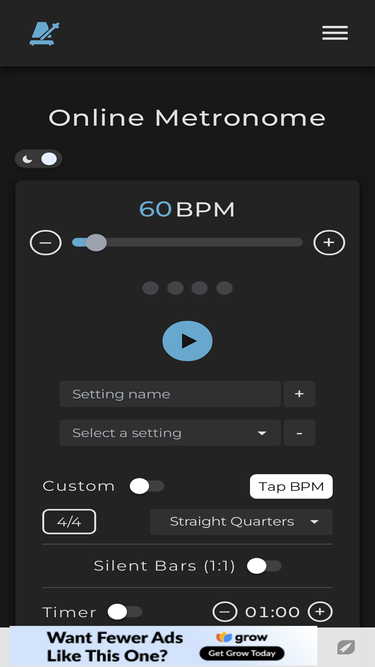 100%The best free online metronome; with 3/4, 4/4, 6/8, 7/8, 9/8, 12/8, 5/4, 6/16 and more time signatures, 12 subdivisions, tap tempo, swing rhythm, and sound customization!