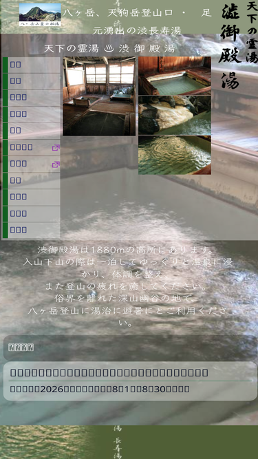 北八ヶ岳 天狗岳の西山麓に湧く秘湯。趣ある木造浴舎の東の湯には、足元湧出の渋長寿湯など3つの湯船があり、武田信玄の頃から傷病兵癒しの湯として利用されてきました。奥蓼科温泉郷 渋の湯の最上部、バスで渋の湯線の終点にあり、渋の湯口登山指導所はすぐ上手になります。