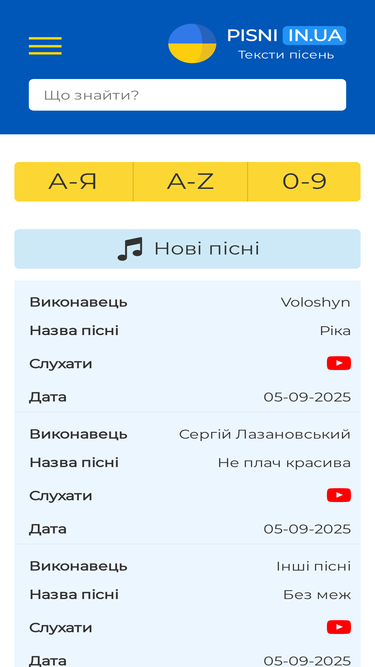 88%Тексти пісень (лірика) всіх українських виконавців, народні пісні, ноти, записи у форматі mp3. Інформація про виконавців, гурти, альбоми та лейбли. Співай НАШЕ!