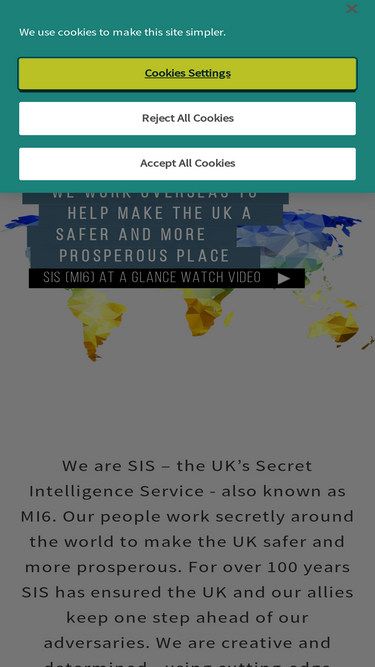 92%We are SIS, the UK’s Secret Intelligence Service, better known as MI6. We are the UK's foreign intelligence service, gathering intelligence and working with partners internationally to make the UK safer and more prosperous.
