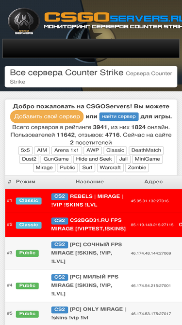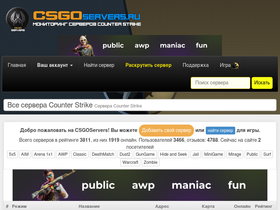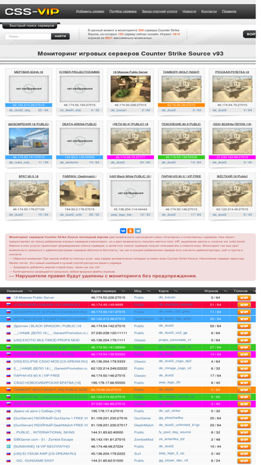 мониторинг серверов counter-strike. на главной странице популярные игровые сервера cs 1.6, cs source, cs go, cs 2
