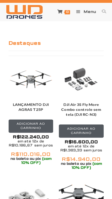 Encontre toda linha de Drones Agr�colas DJI a pronta entrega na Agrobox, incluindo modelos Agras T50, T25, T40, T20P, T30 e T10, al�m de baterias e pe�as de reposi��o. Oferecemos entrega r�pida e suporte t�cnico especializado em todo o Brasil.