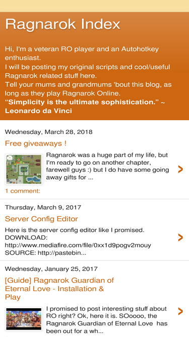 75%Hi, I'm a veteran RO player and an Autohotkey enthusiast. I will be posting my original scripts and cool/useful Ragnarok related stuff here. Tell your mums and grandmums 'bout this blog, as long as they play Ragnarok Online. “Simplicity is the ultimate sophistication.” ~ Leonardo da Vinci