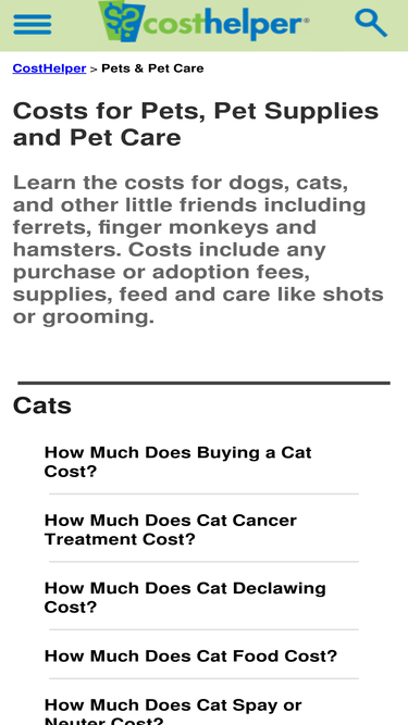 90%costhelper - learn the costs for dogs, cats, and other little friends including ferrets, finger monkeys and hamsters. costs include any purchase or adoption fees, supplies, feed and care like shots or grooming.
