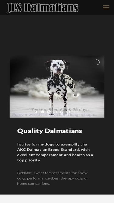 96%jls dalmatians | dalmatian breeder in kansas of show dalmatians, dalmatian puppies. dalmatian breed information as well as pictures and breed health information about dalmatians and dalmatian puppies by breeder owner handler julia soukup, lindsborg, kansas. jls dalmatians is dedicated to promoting and protecting the health, temperament, soundness, and overall integrity of the dalmatian breed. owner/breeder handled.