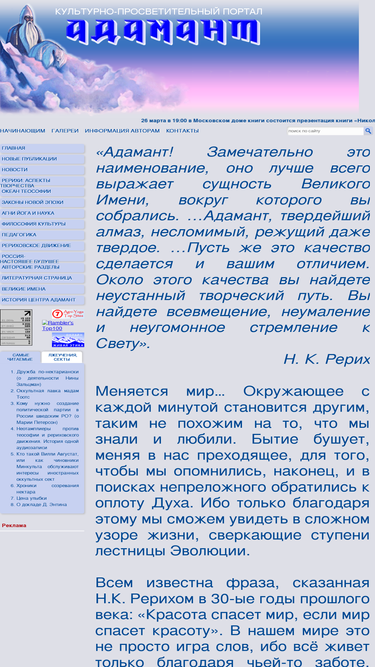 85%культурно-просветительный портал "адамант": мир рерихов и блаватской освещает современное рериховское движение россии. статьи. книги. фото.