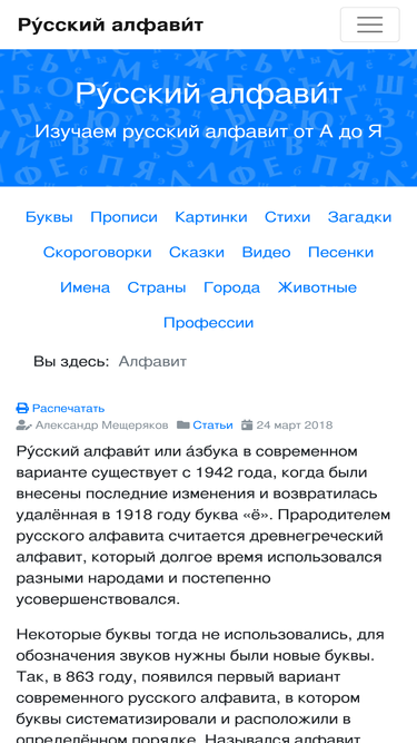 69%Взялись за изучение Ру́сского алфави́та или ру́сской а́збуки тогда Вам к нам!. Мы собрали все необходимые материалы для изучения алфавита с ребенком. Алфавит русского языка, в нынешнем виде состоит из 33-х букв. Мы подготовили для вас программу изучения русского алфавита, вы можете выбрать как будет лучше и легче выучить алфавит вашему ребёнку. Сказки, стихи, скороговорки и много другое мы составили для каждой буквы