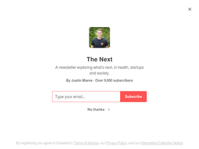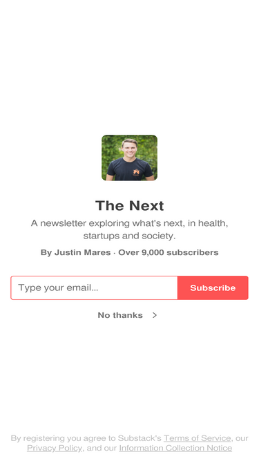 87%A newsletter exploring what's next, in health, startups and society. Click to read The Next, by Justin Mares, a Substack publication with tens of thousands of subscribers.