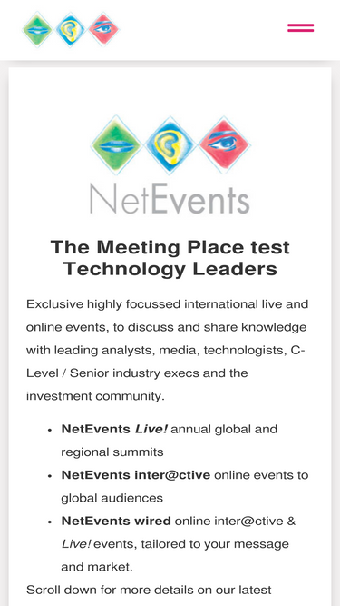 91%NetEvents Overview The Meeting Place test Technology Leaders Exclusive highly focussed international live and online events, to discuss and share knowledge with leading analysts, media, technologists, C-Level / Senior industry execs and the investment community. NetEvents Live! annual global and regional summits NetEvents inter@ctive online events to global audiences Scroll down for more details on […]