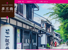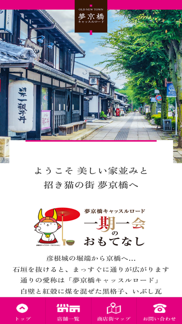 100%彦根城の堀端から京橋へ。石垣を抜けると、まっすぐに通りが広がります。食べる・楽しむ・暮らすを一度に味わえる古くて新しい町