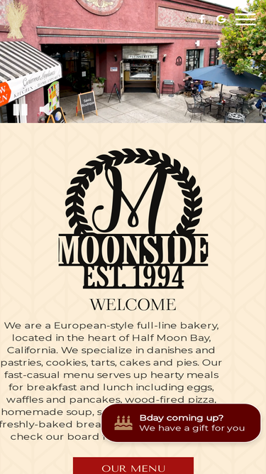 100%We are a European-style full-line bakery, located in the heart of Half Moon Bay, California. We specialize in danishes and pastries, cookies, tarts, cakes and pies. Our fast-casual menu serv...